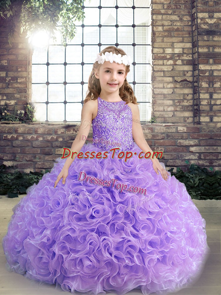 Fashion Scoop Sleeveless Kids Formal Wear Floor Length Beading and Ruching Lavender Fabric With Rolling Flowers