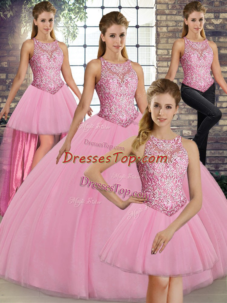 Fashion Sleeveless Tulle Floor Length Lace Up Sweet 16 Dresses in Pink with Embroidery