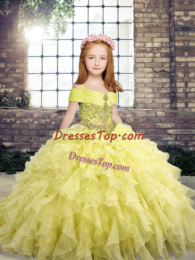 Fashion Yellow Sleeveless Floor Length Beading and Ruffles Lace Up Child Pageant Dress