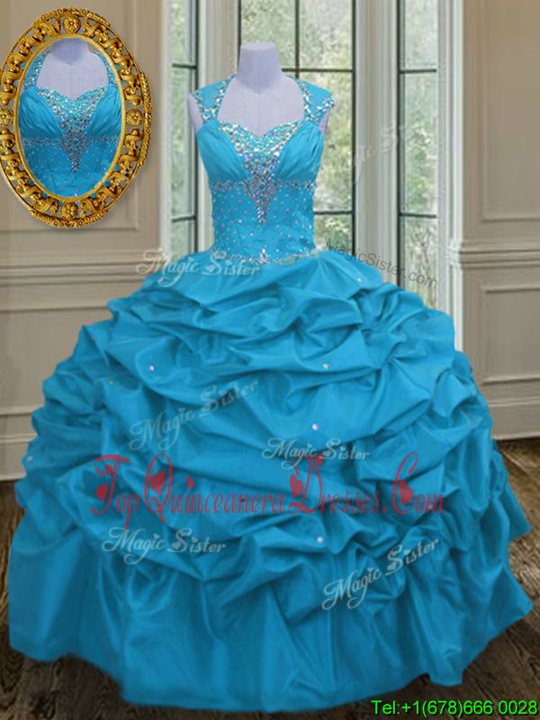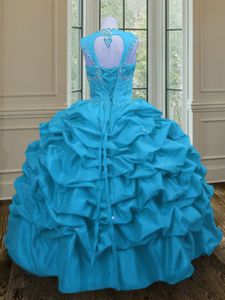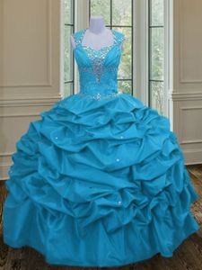 Fashionable Aqua Blue Lace Up Straps Beading and Pick Ups Sweet 16 Dresses Taffeta Sleeveless