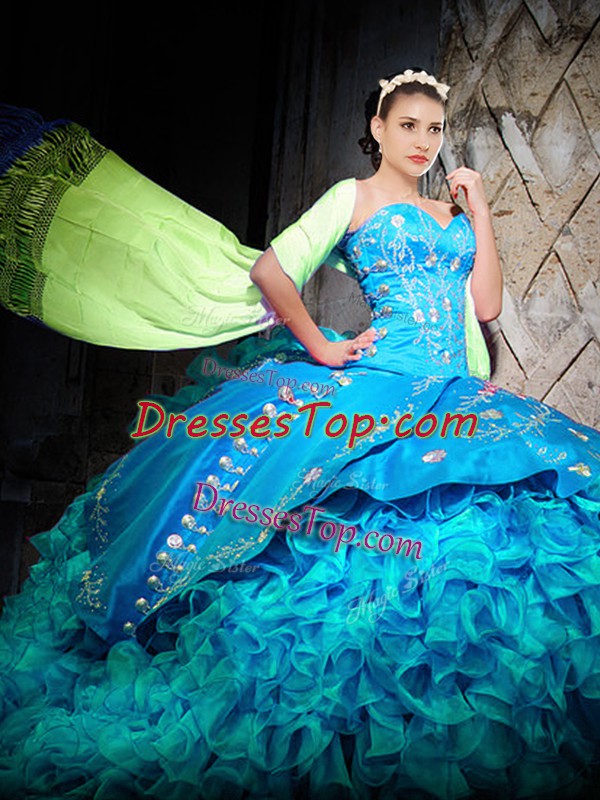 Fashionable Baby Blue Quince Ball Gowns Sweetheart Sleeveless Brush Train Lace Up