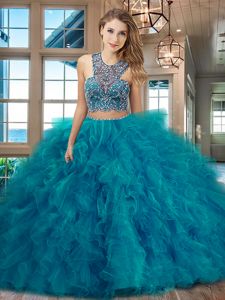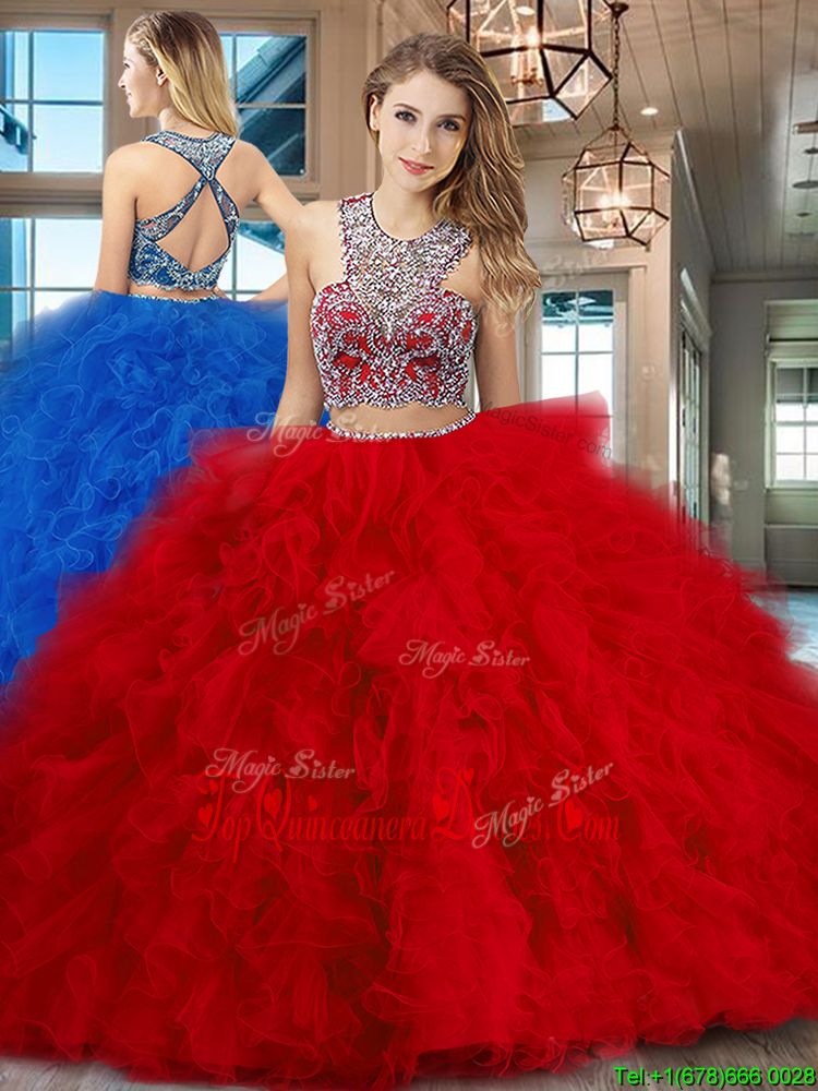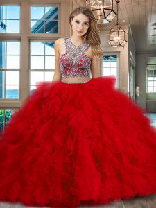 Fashionable Brush Train Two Pieces Quince Ball Gowns Red Scoop Tulle Sleeveless With Train Criss Cross