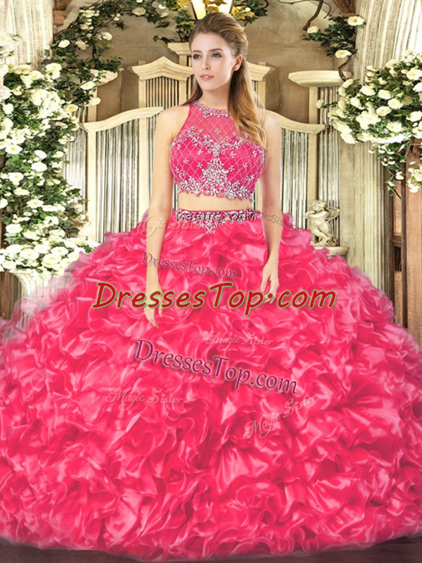 Fashionable Coral Red Sleeveless Beading and Ruffles Floor Length Quinceanera Dresses