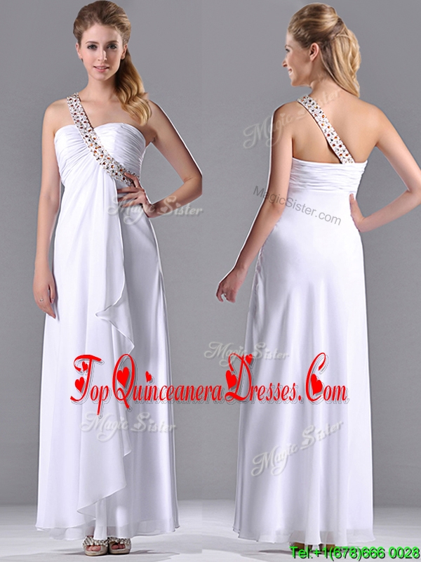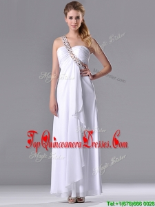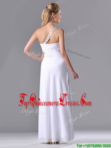 Fashionable Empire One Shoulder Chiffon Side Zipper White Dama Dress with Beading