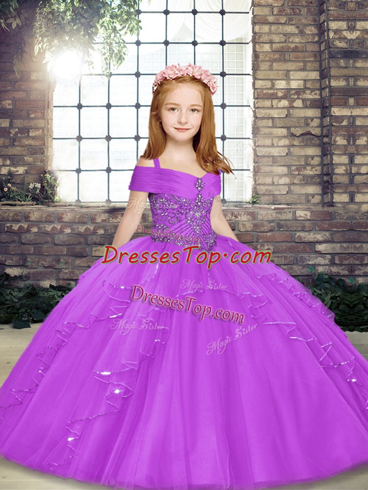 Fashionable Floor Length Lilac Little Girl Pageant Dress Straps Sleeveless Lace Up