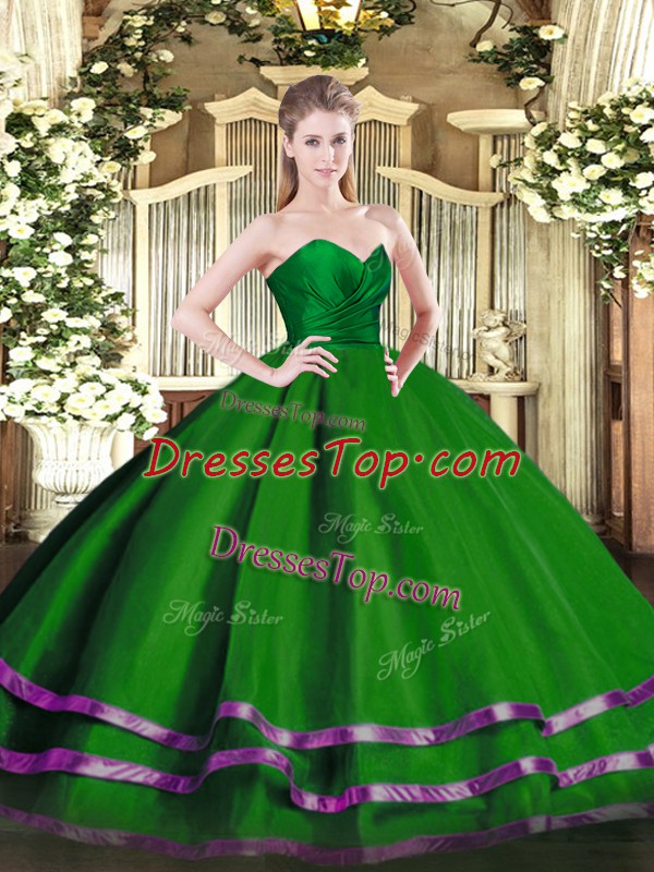 Fashionable Green Tulle Zipper Sweetheart Sleeveless Floor Length 15 Quinceanera Dress Ruffled Layers