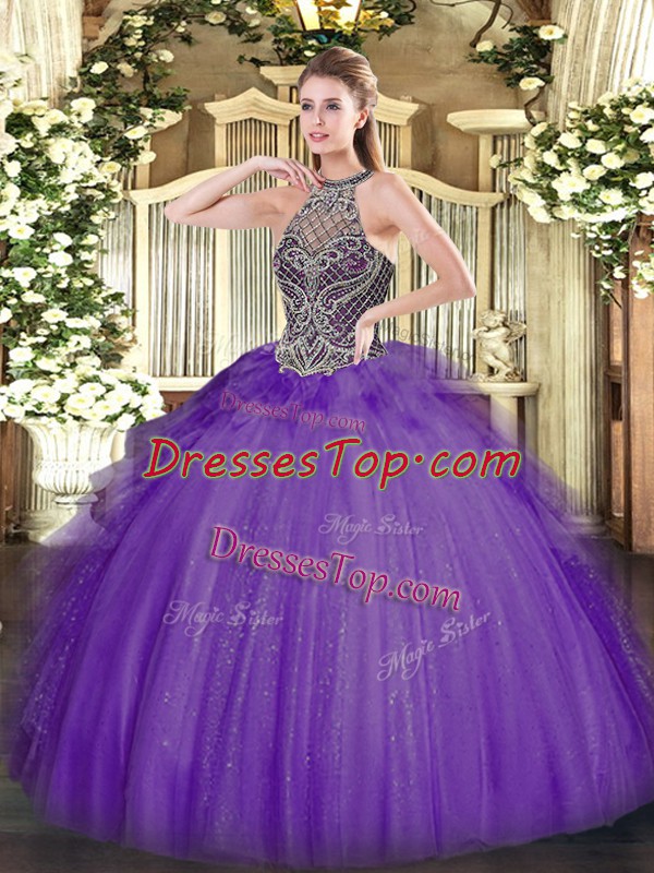 Fashionable Halter Top Sleeveless Lace Up Sweet 16 Quinceanera Dress Lavender Tulle