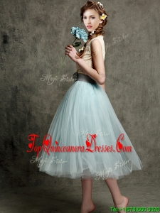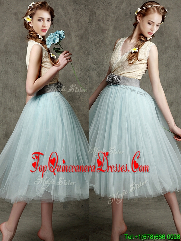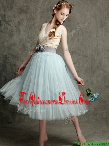 Fashionable Hand Made Flowers and Belted V Neck Damas Dress in Apple Green