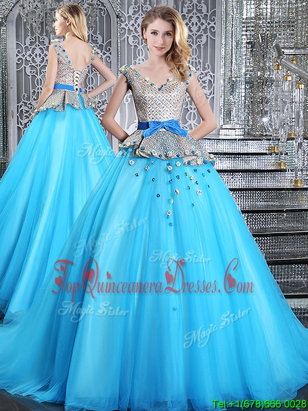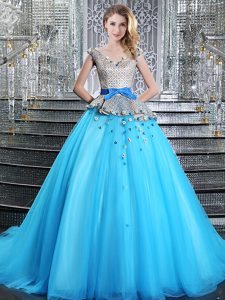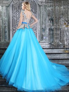 Fashionable Lace Up 15 Quinceanera Dress Baby Blue and In for Military Ball and Sweet 16 and Quinceanera with Appliques and Belt Brush Train
