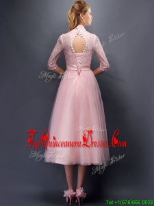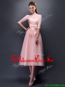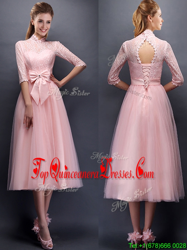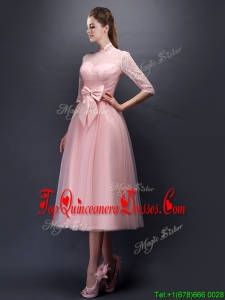 Fashionable Laced High Neck Half Sleeves Damas Dress with Bowknot