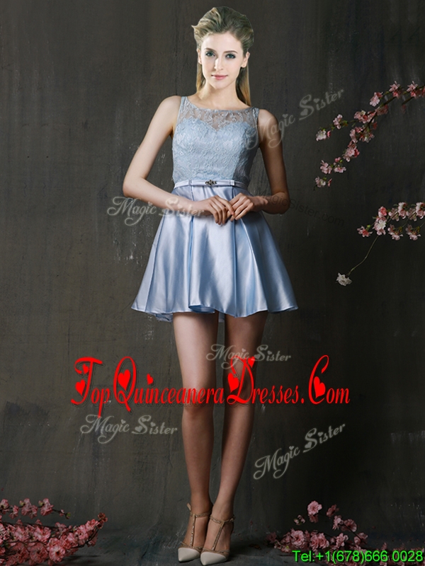 Fashionable Light Blue Short Damas Dress with Lace and Belt