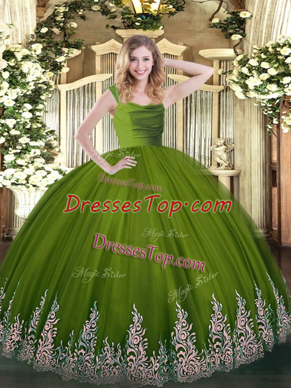 Fashionable Olive Green Ball Gowns Tulle Straps Sleeveless Beading and Appliques Floor Length Zipper Quinceanera Gowns