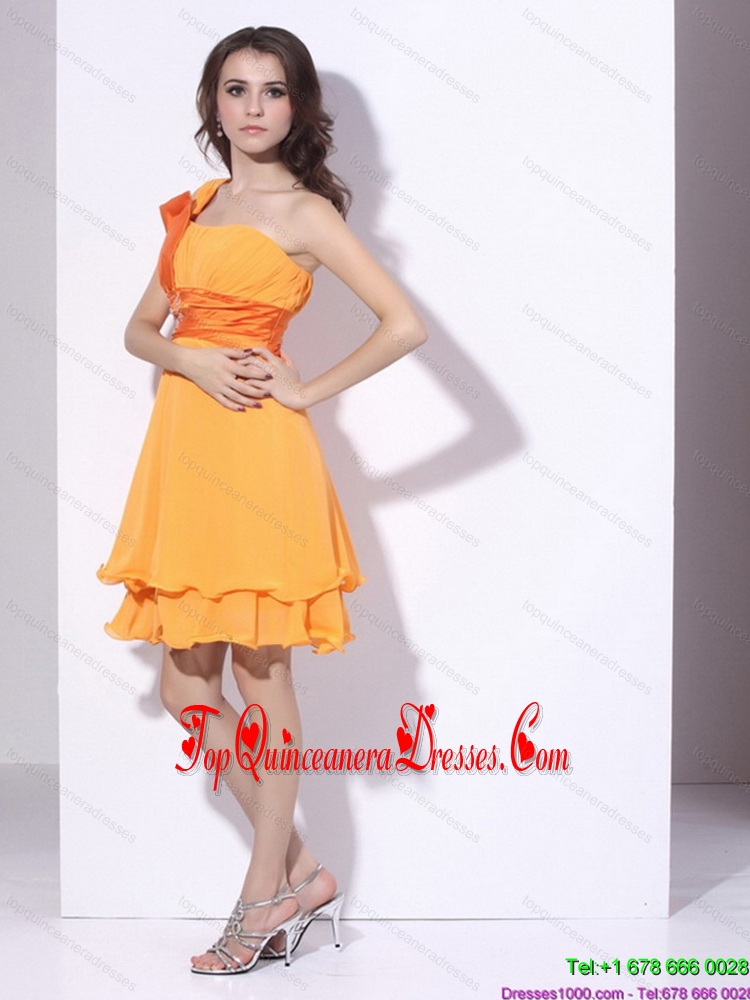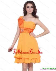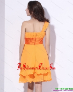 Fashionable One Shoulder Gold Damas Dresses with Ruching and Beading