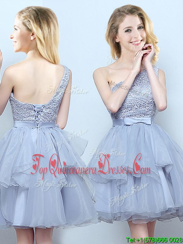 Fashionable One Shoulder Sleeveless Lace Up Mini Length Lace and Ruffles and Belt Quinceanera Court of Honor Dress