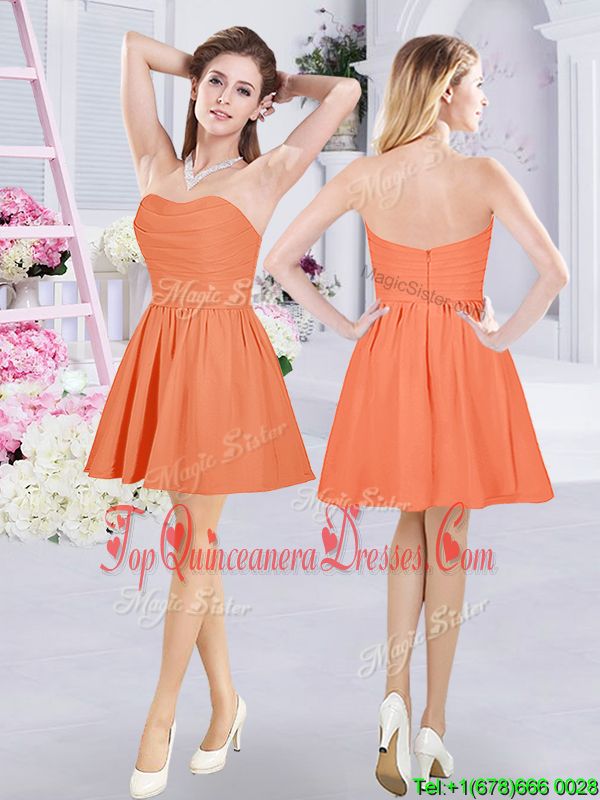 Fashionable Orange A-line Strapless Sleeveless Chiffon Mini Length Zipper Ruching Vestidos de Damas