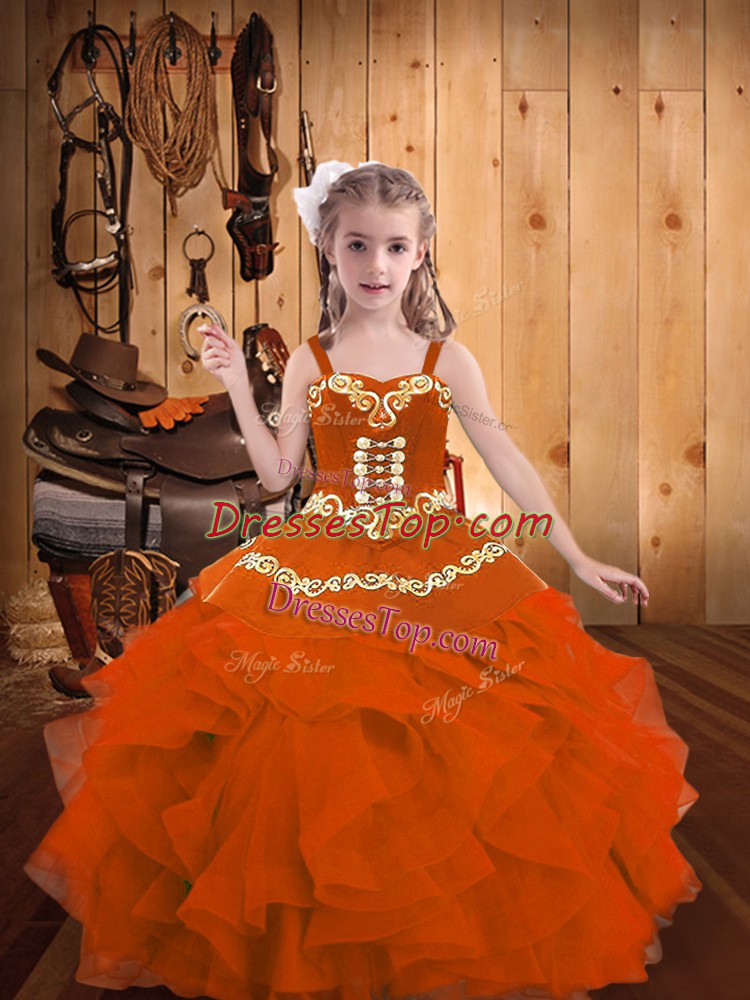 Fashionable Orange Red Organza Lace Up Straps Sleeveless Floor Length High School Pageant Dress Embroidery and Ruffles