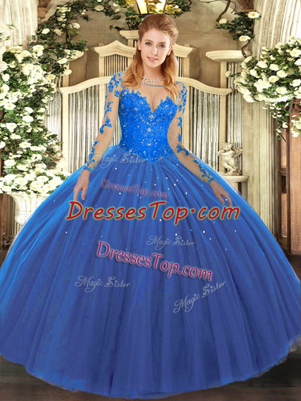 Fashionable Scoop Long Sleeves Ball Gown Prom Dress Floor Length Lace Blue Tulle