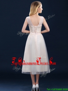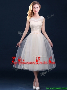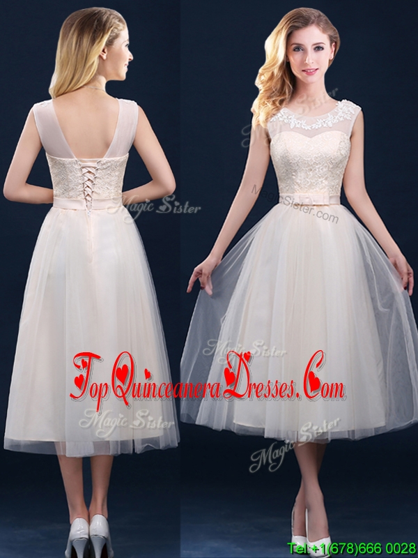 Fashionable See Through Champagne Damas Dress with Appliques and Belt