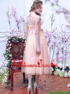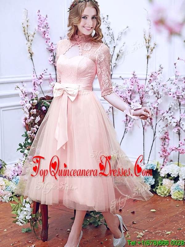 Fashionable See Through High Neck Half Sleeves Damas Dress with Bowknot