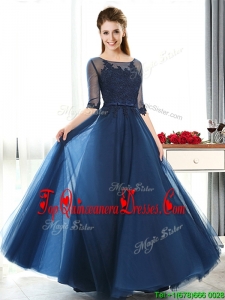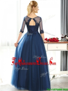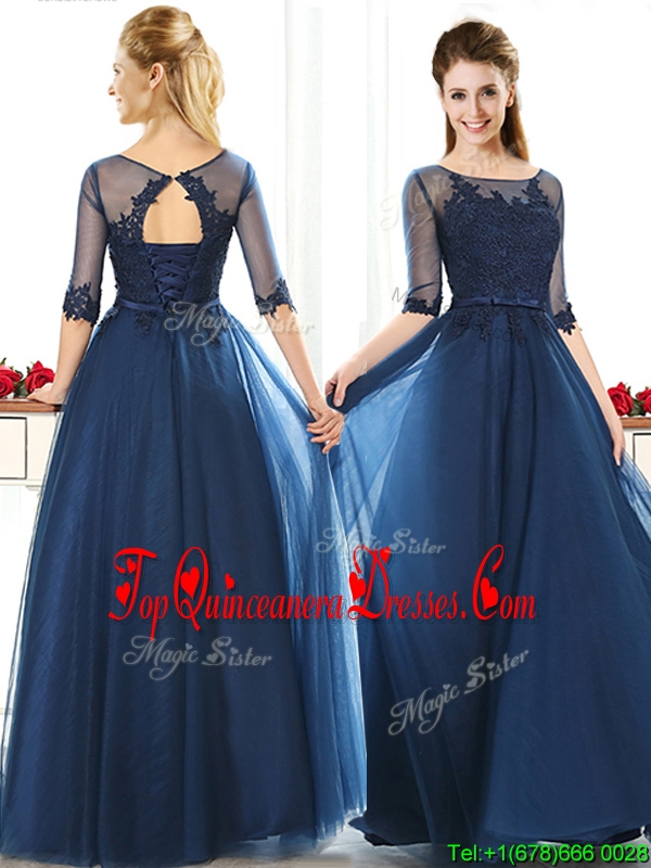 Fashionable See Through Scoop Half Sleeves Damas Dress with Lace and Belt