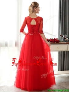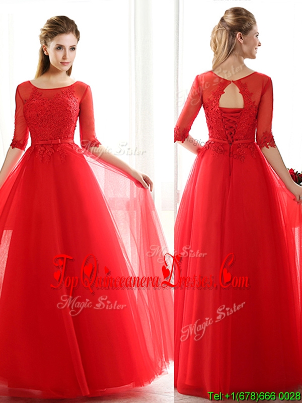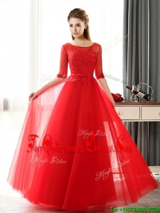 Fashionable See Through Scoop Half Sleeves Red Damas Dress with Lace and Belt