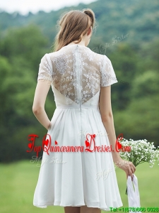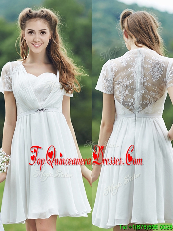 Fashionable See Through Short Sleeves White Damas Dress with Belt and Lace