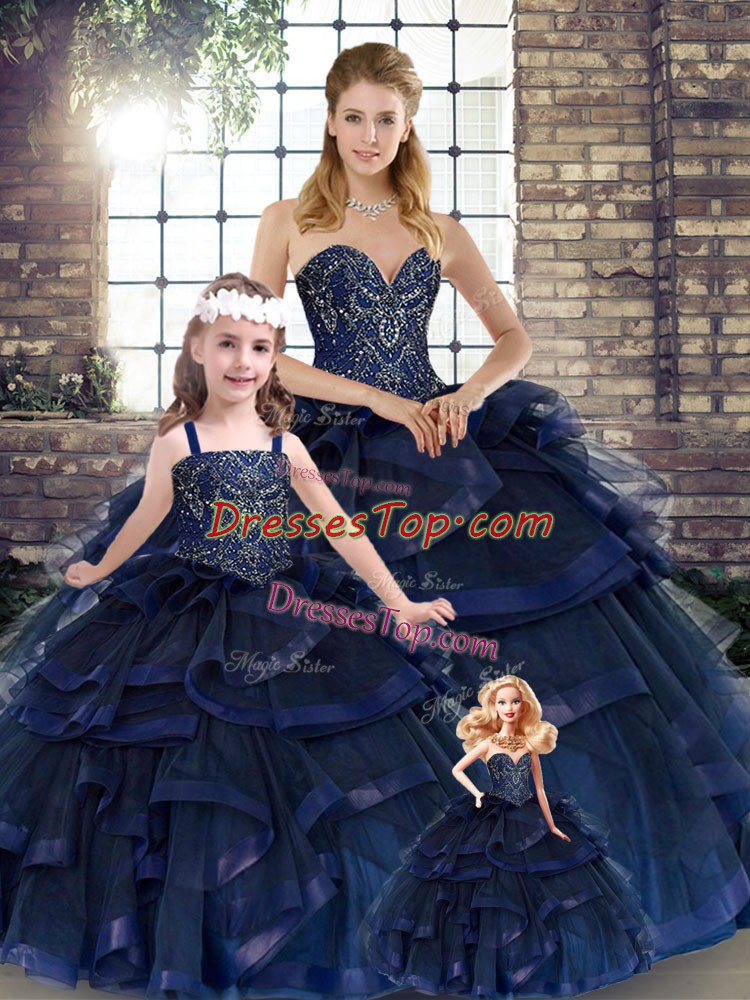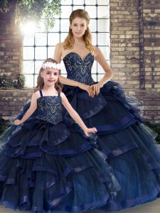 Fashionable Sleeveless Tulle Floor Length Lace Up Quinceanera Dresses in Navy Blue with Beading and Ruffles
