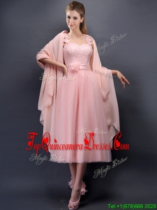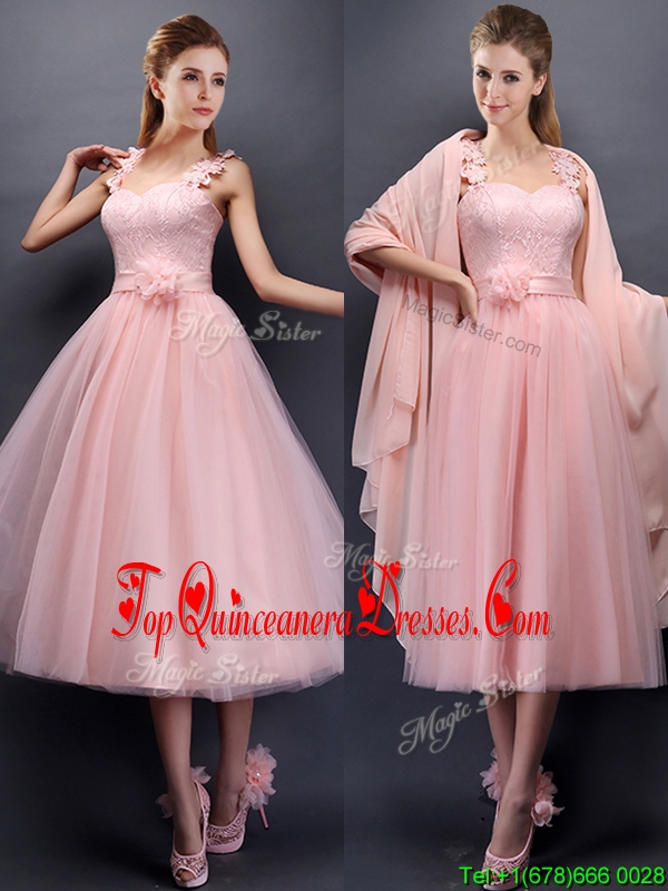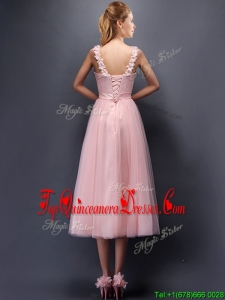 Fashionable Straps Baby Pink Damas Dress with Appliques and Hand Made Flowers