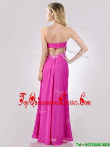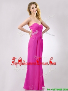 Fashionable Sweetheart Backless Beaded and Ruched Dama Dress in Hot Pink