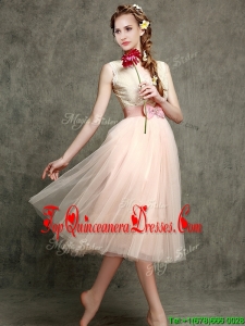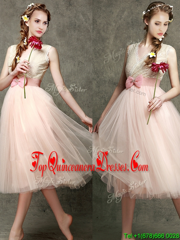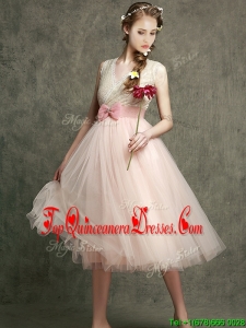 Fashionable Tea Length V Neck Damas Dress with Belt and Bowknot