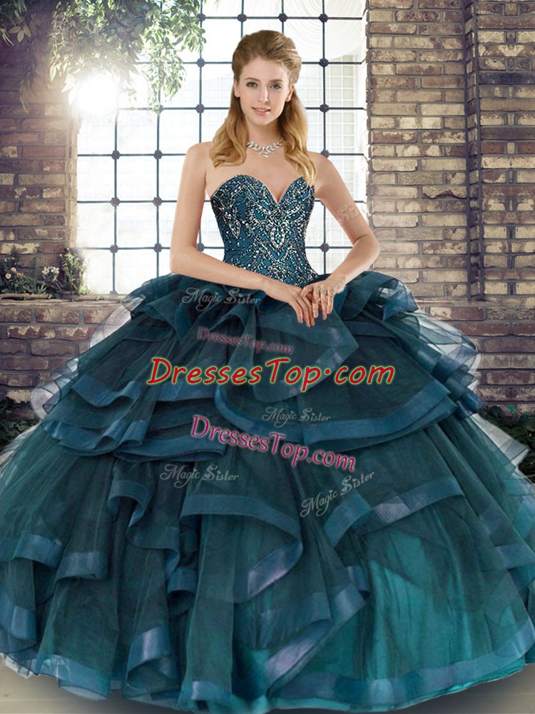 Fashionable Teal Sweet 16 Quinceanera Dress Military Ball and Sweet 16 and Quinceanera with Beading and Ruffles Sweetheart Sleeveless Lace Up