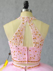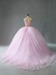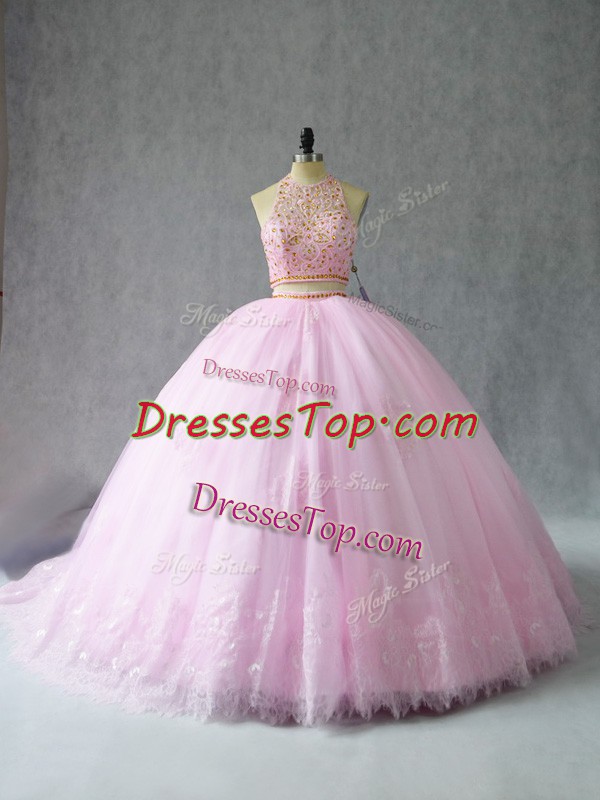 Fashionable Tulle Halter Top Sleeveless Court Train Zipper Beading and Appliques 15th Birthday Dress in Baby Pink