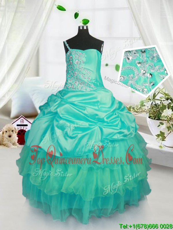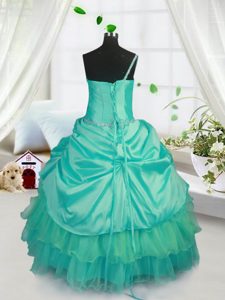 Fashionable Turquoise Sleeveless Beading and Ruffled Layers and Pick Ups Floor Length Girls Pageant Dresses