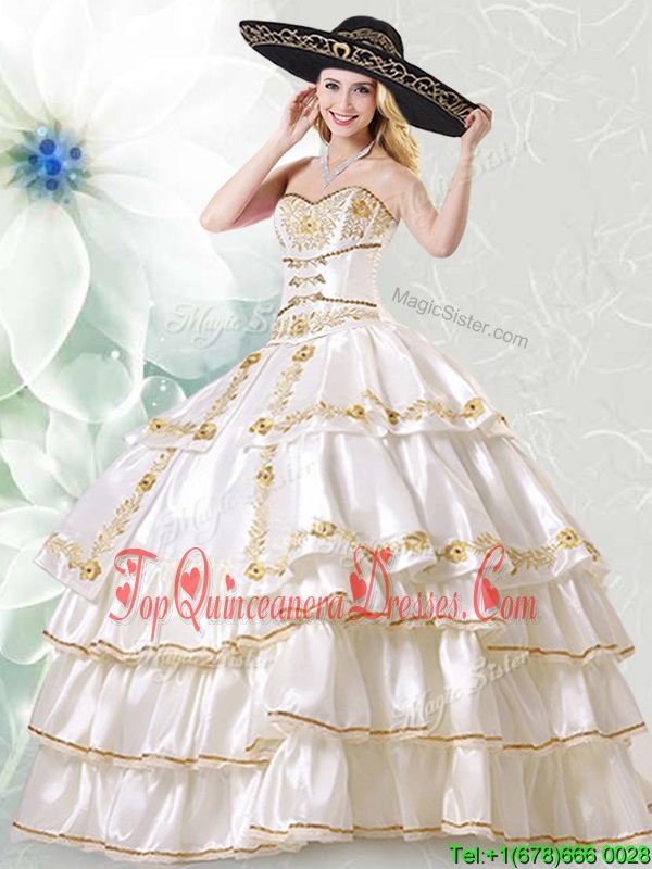 Fashionable White Quinceanera Gowns Military Ball and Sweet 16 and Quinceanera and For with Embroidery and Ruffled Layers Sweetheart Sleeveless Lace Up