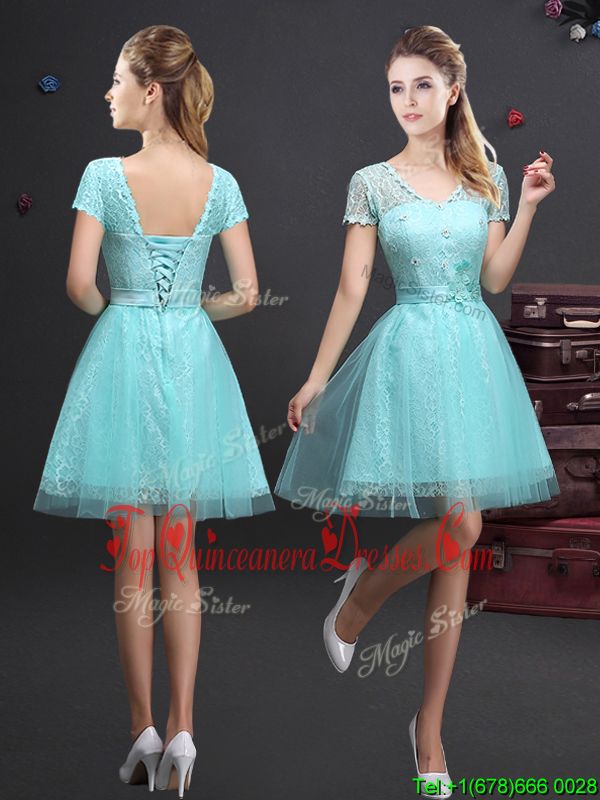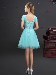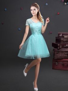 Fine A-line Quinceanera Dama Dress Aqua Blue V-neck Tulle Short Sleeves Mini Length Lace Up