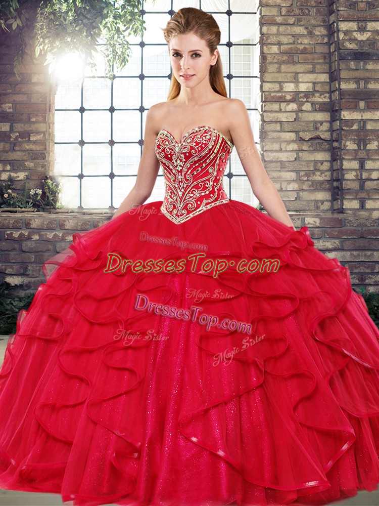 Fine Beading and Ruffles Quinceanera Gowns Red Lace Up Sleeveless Floor Length