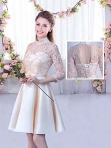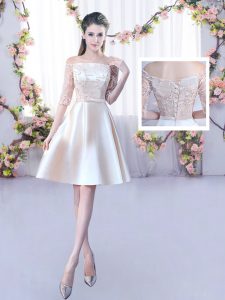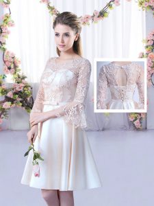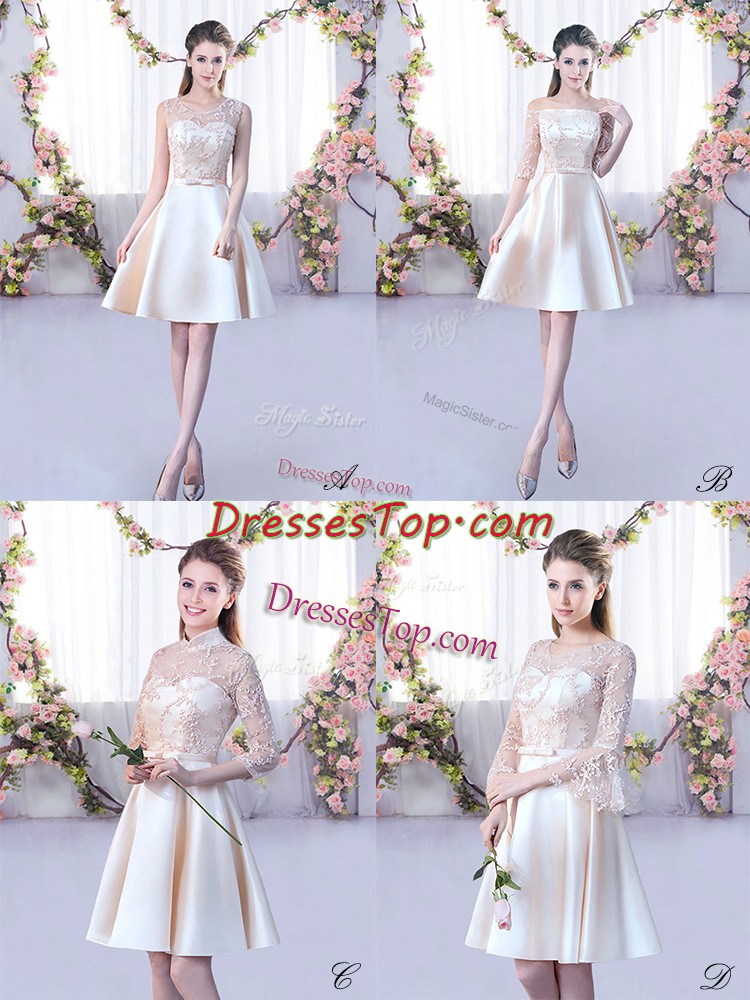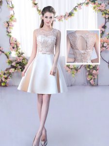 Fine Champagne A-line Satin Scoop Sleeveless Lace and Belt Mini Length Lace Up Quinceanera Dama Dress