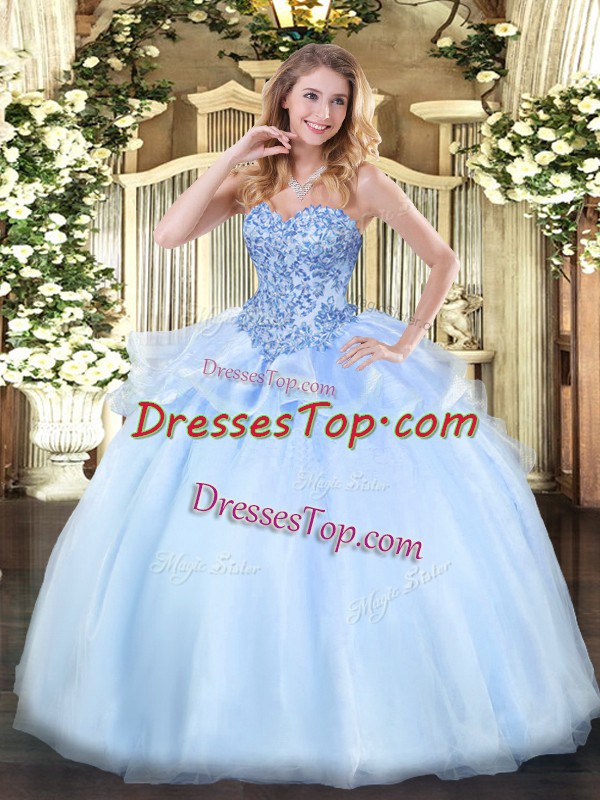 Fine Floor Length Lace Up Vestidos de Quinceanera Light Blue for Sweet 16 and Quinceanera with Appliques