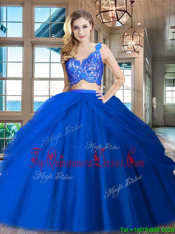 Fine Floor Length Royal Blue 15 Quinceanera Dress Tulle Sleeveless Lace and Ruffled Layers