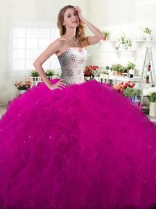 Fine Fuchsia Ball Gowns Beading and Ruffles 15 Quinceanera Dress Lace Up Tulle Sleeveless Floor Length