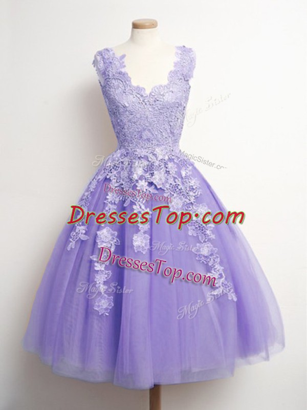 Fine Lavender A-line Appliques Court Dresses for Sweet 16 Lace Up Tulle Sleeveless Knee Length