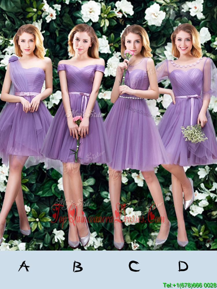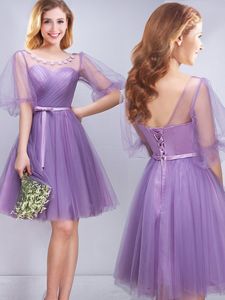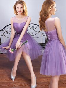 Fine Lavender A-line One Shoulder Sleeveless Tulle Mini Length Lace Up Beading and Appliques and Ruffles and Ruching and Belt and Hand Made Flower Damas Dress