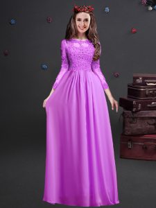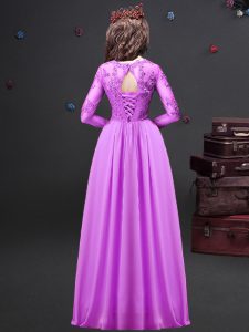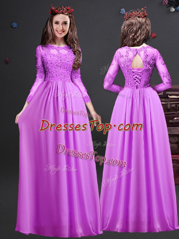 Fine Lilac Empire Chiffon Scoop Long Sleeves Appliques Floor Length Lace Up Court Dresses for Sweet 16