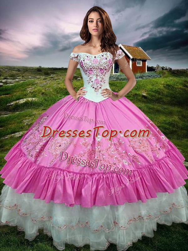 Fine Rose Pink Ball Gowns Off The Shoulder Sleeveless Taffeta Floor Length Lace Up Beading and Embroidery and Ruffled Layers Quinceanera Gown