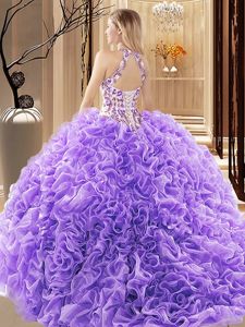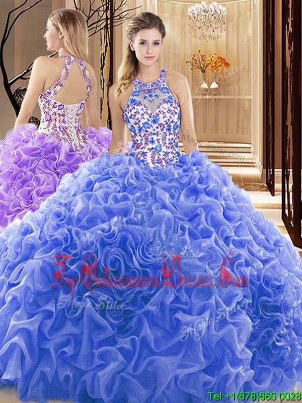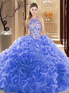 Fine Sleeveless Embroidery and Ruffles Backless 15 Quinceanera Dress with Blue Court Train