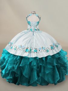 Fine Sleeveless Floor Length Embroidery and Ruffles Lace Up Quinceanera Gown with Teal