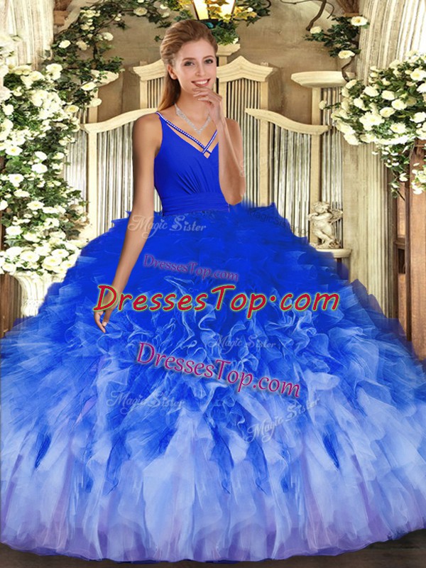 Fine V-neck Sleeveless 15th Birthday Dress Floor Length Beading and Ruffles Multi-color Tulle