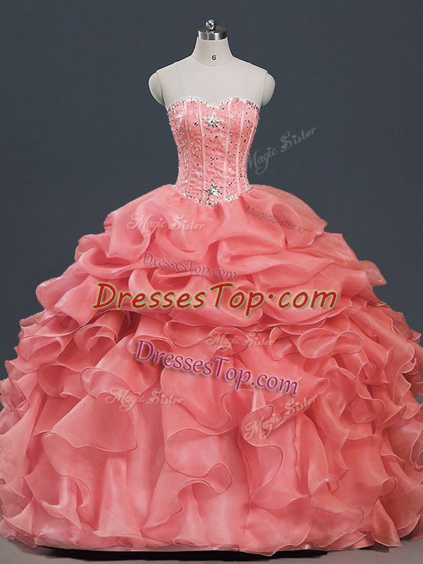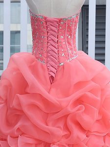 Fine Watermelon Red Organza Lace Up Sweetheart Sleeveless Floor Length Vestidos de Quinceanera Beading and Ruffles and Pick Ups