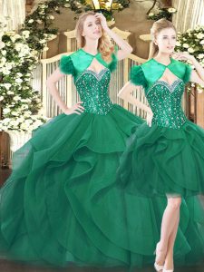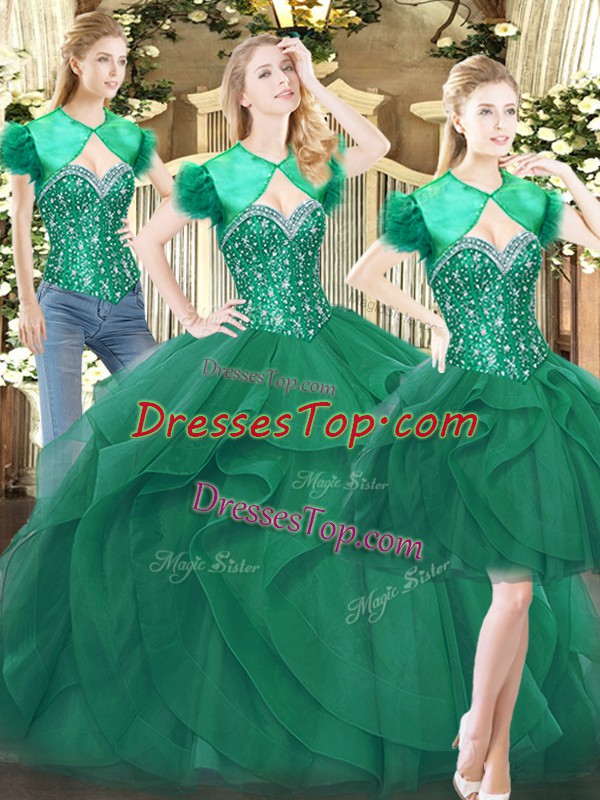 Fitting Dark Green Tulle Lace Up Sweetheart Sleeveless Floor Length Ball Gown Prom Dress Beading and Ruffles