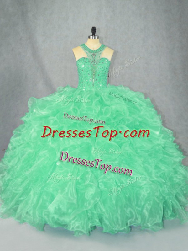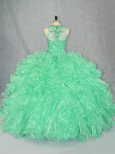 Fitting Floor Length Apple Green 15 Quinceanera Dress Organza Sleeveless Beading and Ruffles